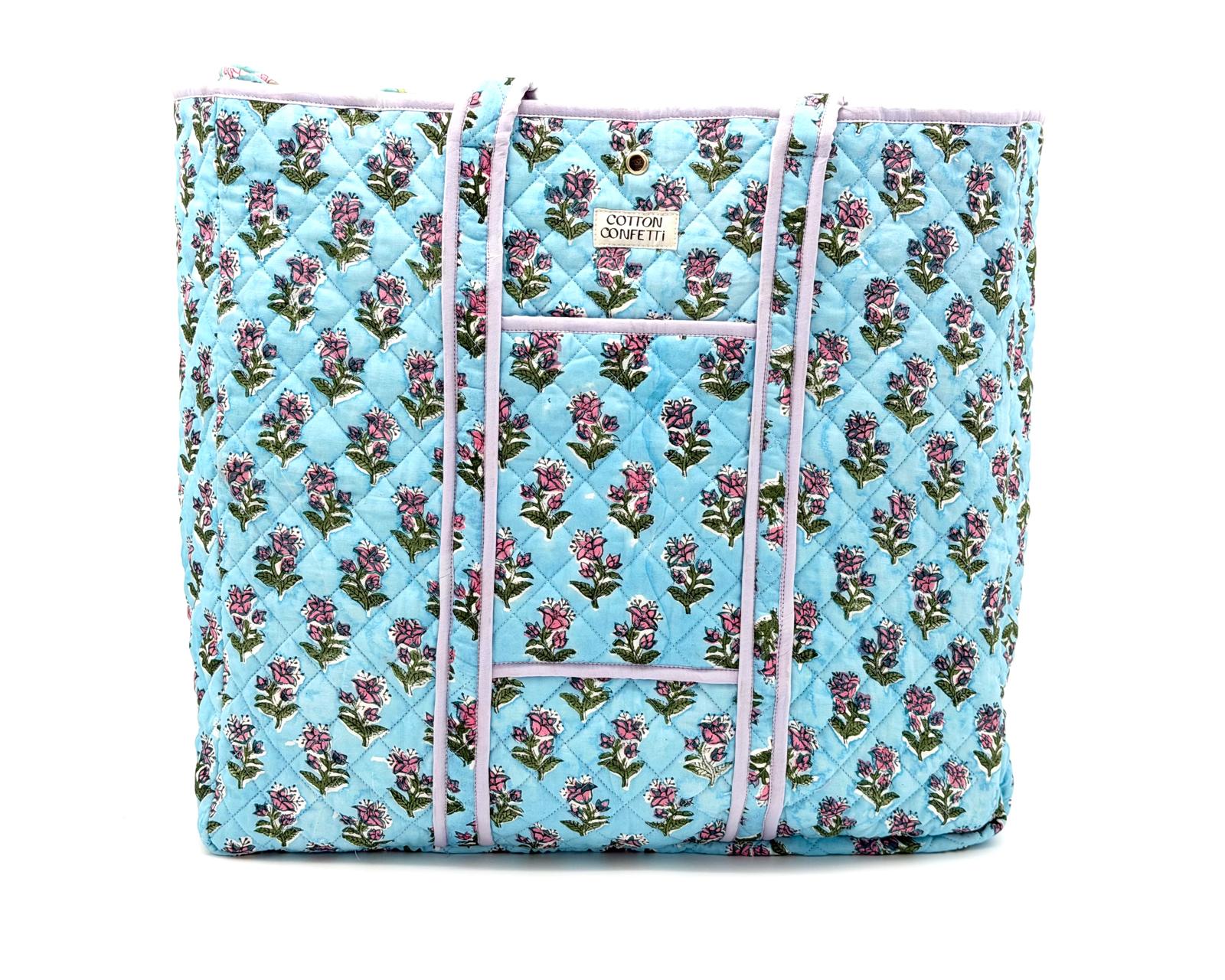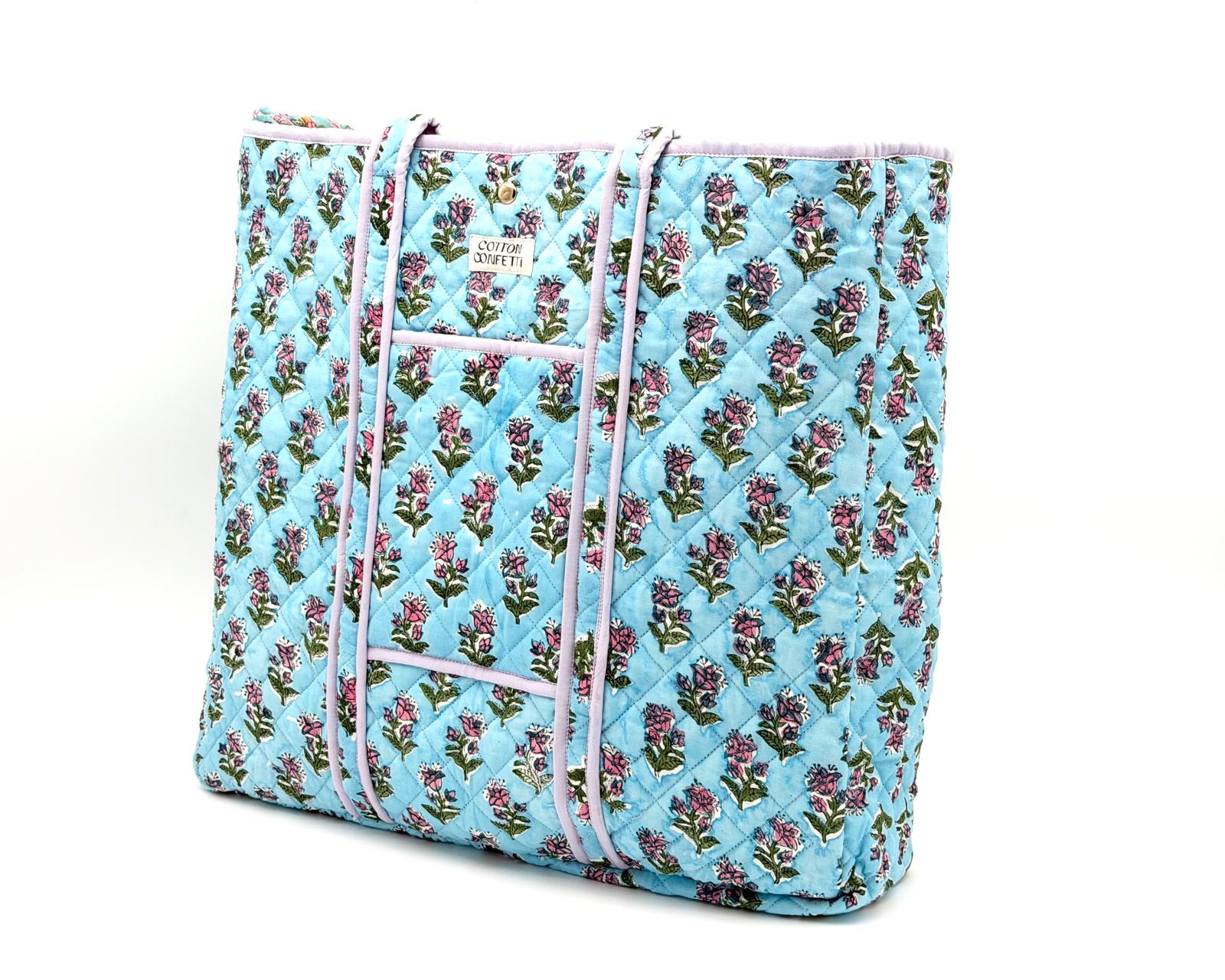 A beautiful blend of sky blue and lilac hues, with pink trims and reversible floral lilac print inside. This bag is designed to last for life. Discover our blend of sturdy structure, soft fabrics and bold prints with our perfectly sized, reversible tote. From farmers market visits to that much needed errand run, a stroll around the city, a weekend getaway, or workout session – it's got you covered. The only challenge? Deciding which of its awesome, reversible prints to show off today :)