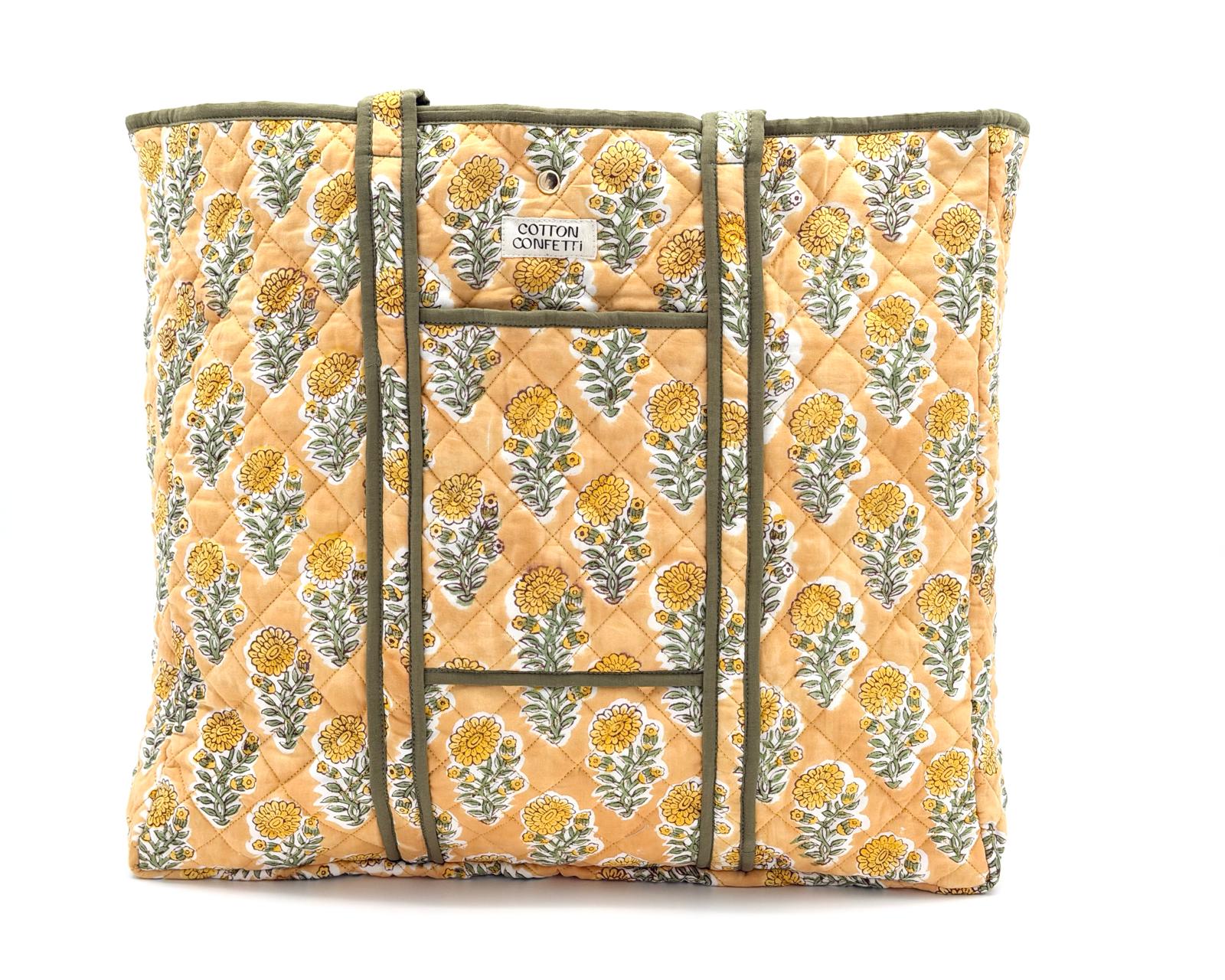 Inspired by the beauty of a marigold field on a clear blue sky - yellow hue print, with green trims and reversible blue print inside. This bag is designed to last for life. Discover our blend of sturdy structure, soft fabrics and bold prints with our perfectly sized, reversible tote. From farmers market visits to that much needed errand run, a stroll around the city, a weekend getaway, or workout session – it's got you covered. The only challenge? Deciding which of its awesome, reversible prints to show off today :)